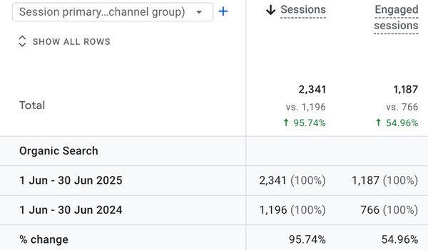 - Sessions jumped from 1,196 to 2,341 (95.74% growth)
